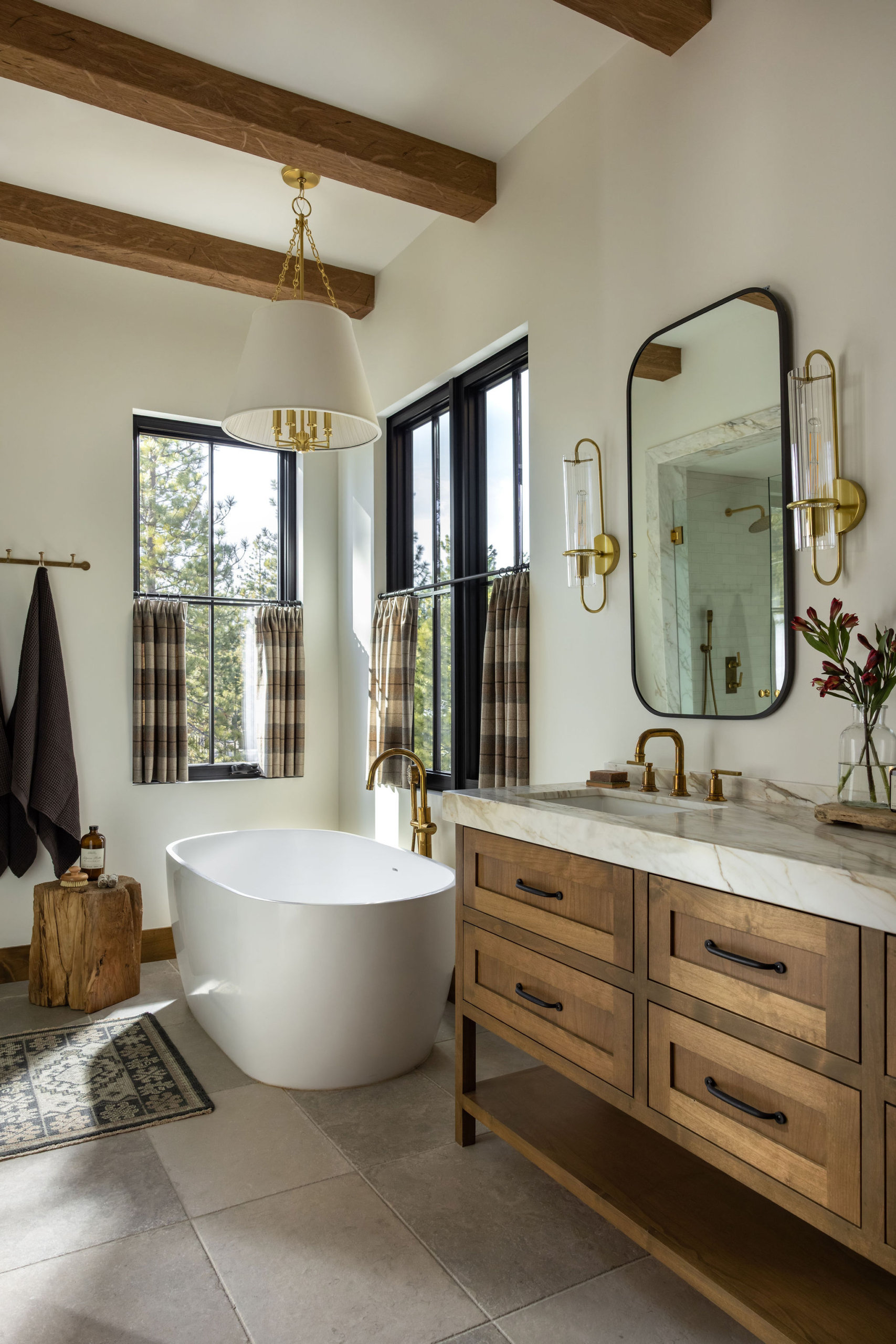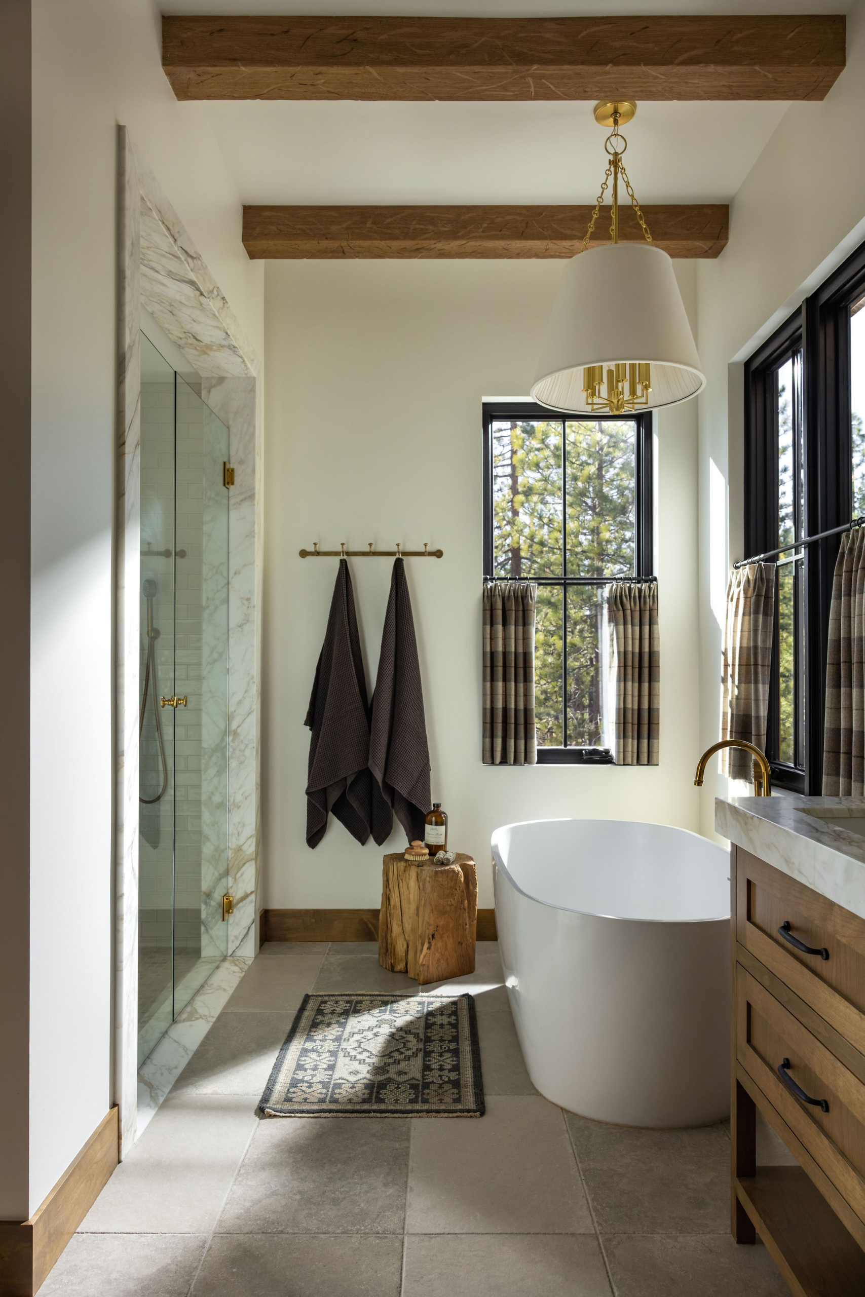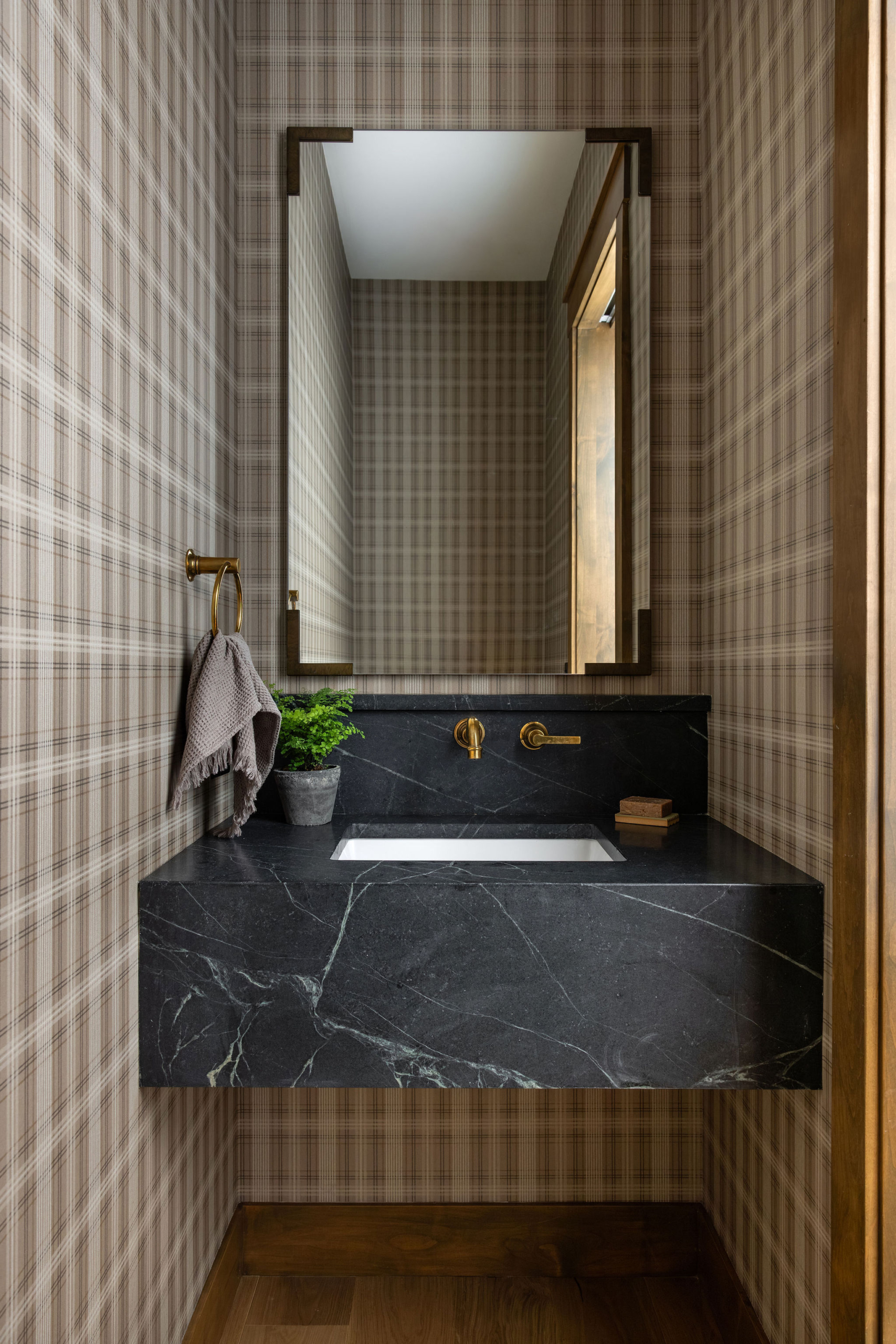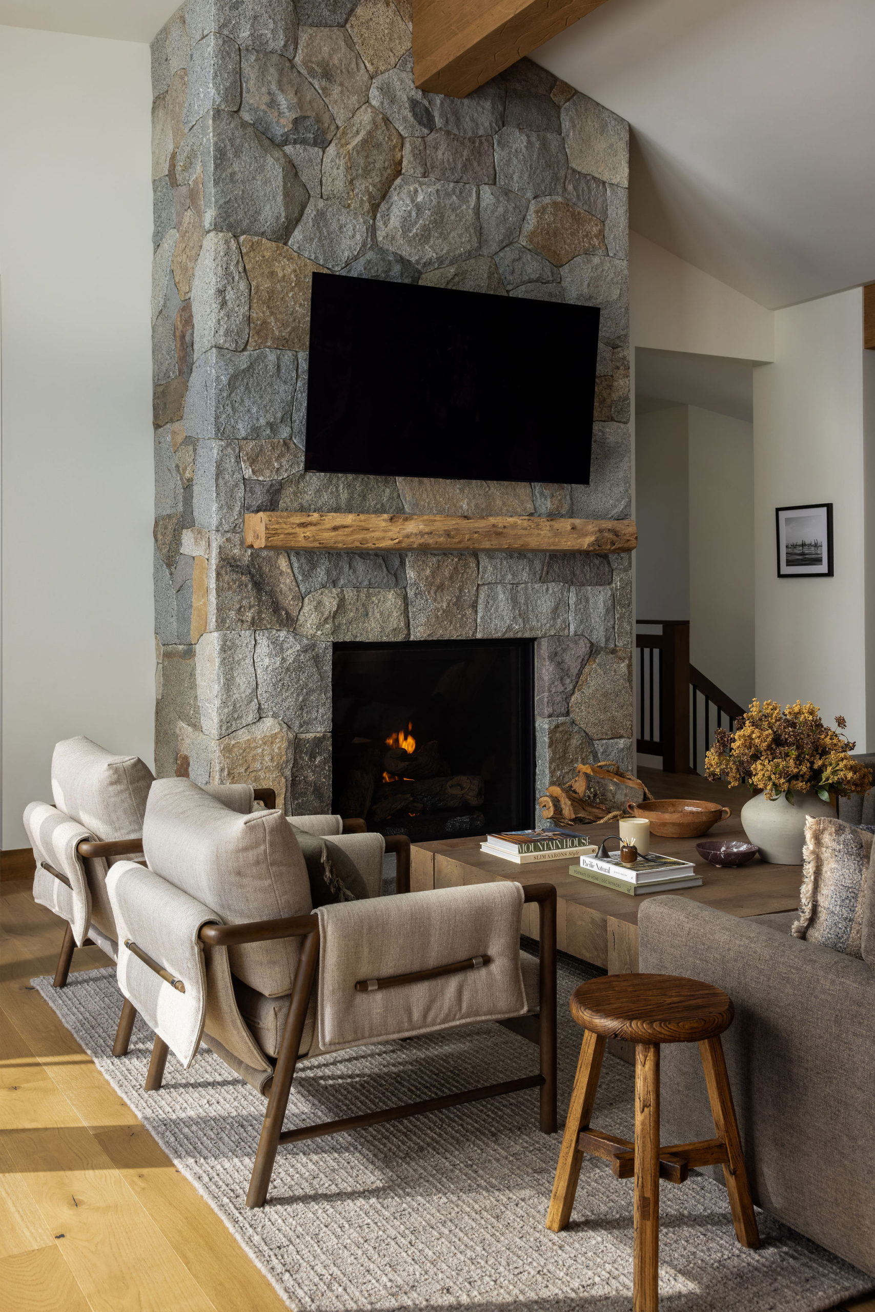 Custom elements — from a hand-chiseled fireplace crafted from local Tahoe granite to marble paired with wool curtains in the primary bath — anchor the design with a strong sense of place, blending timeless refinement with rustic warmth.