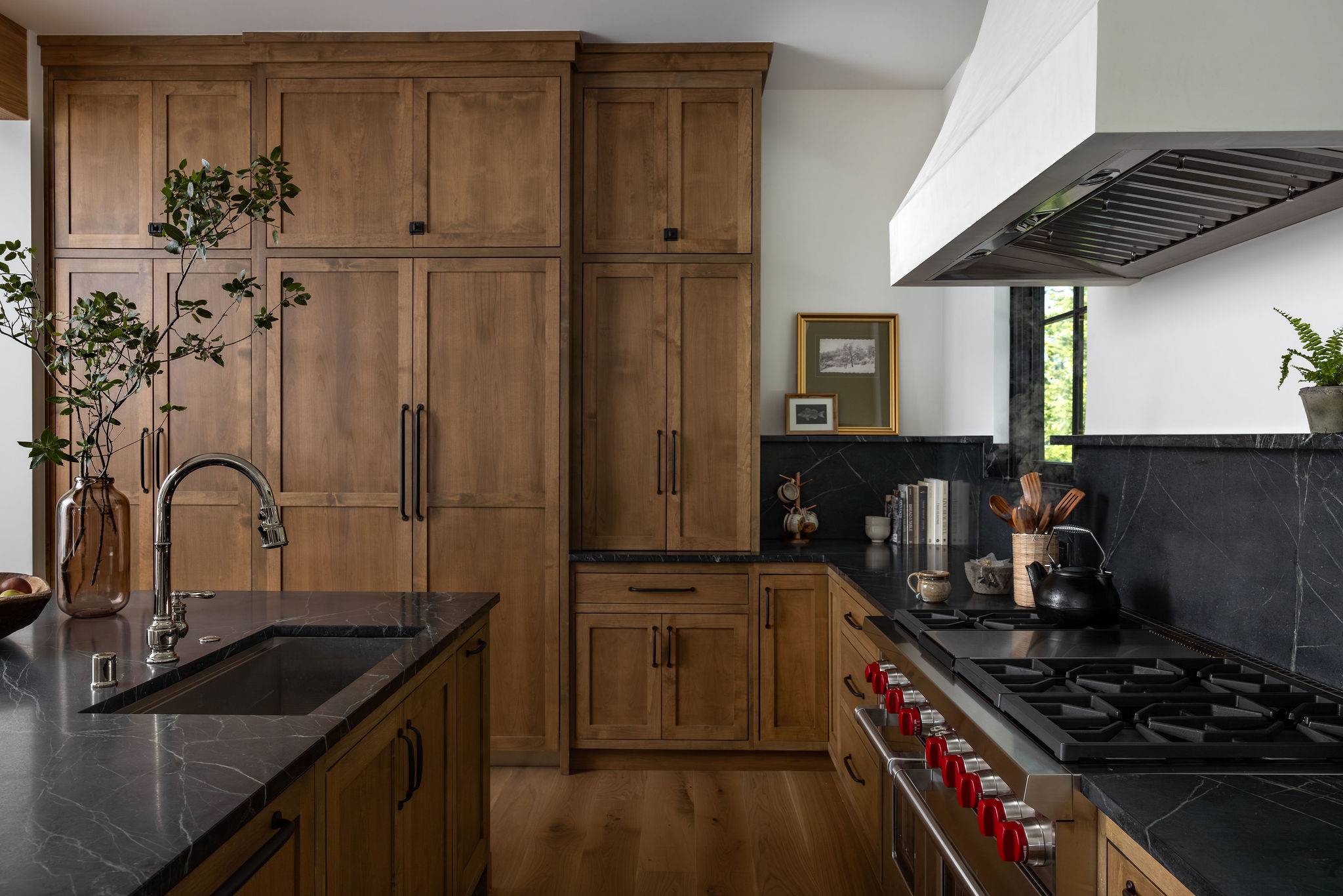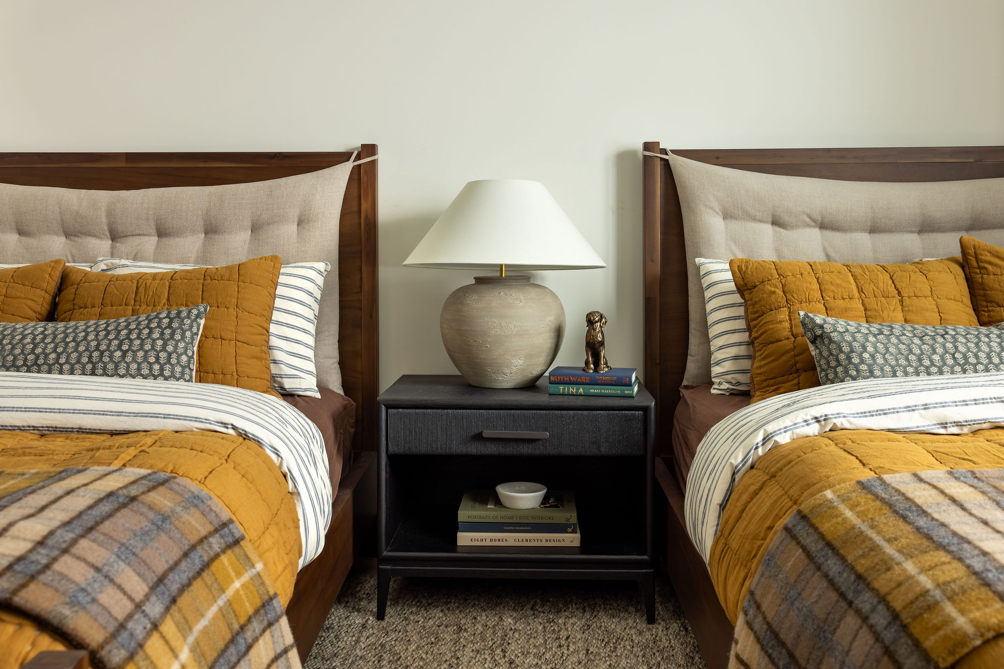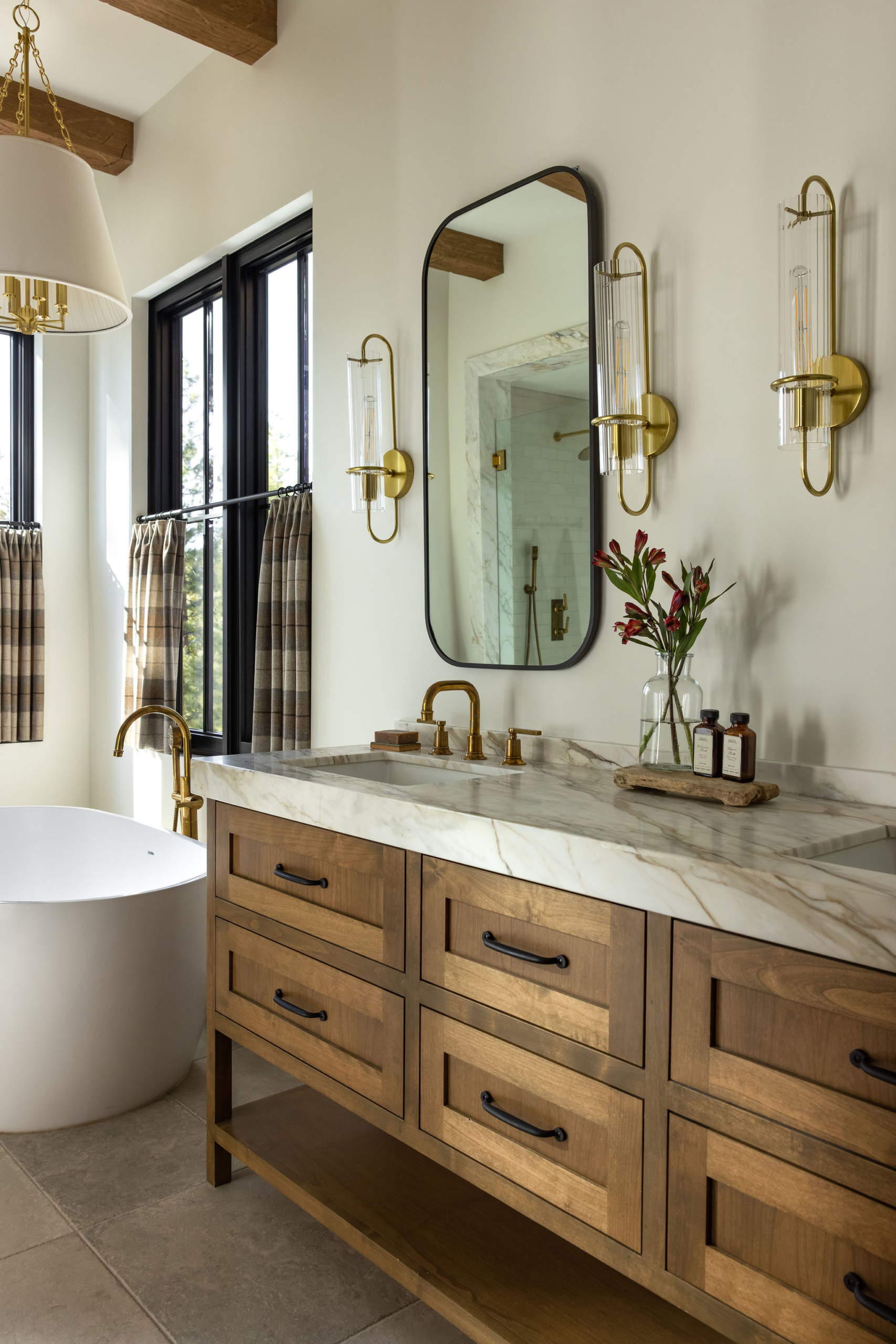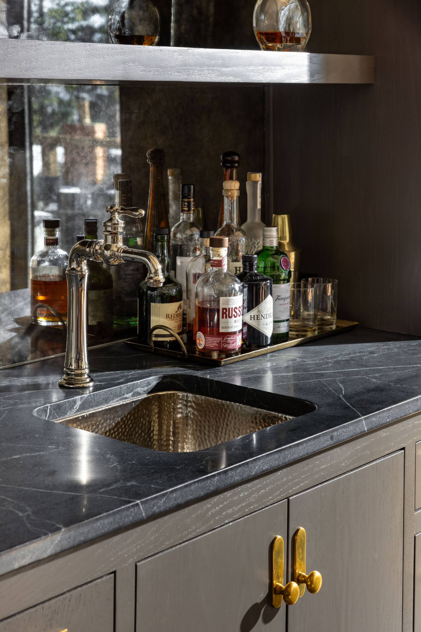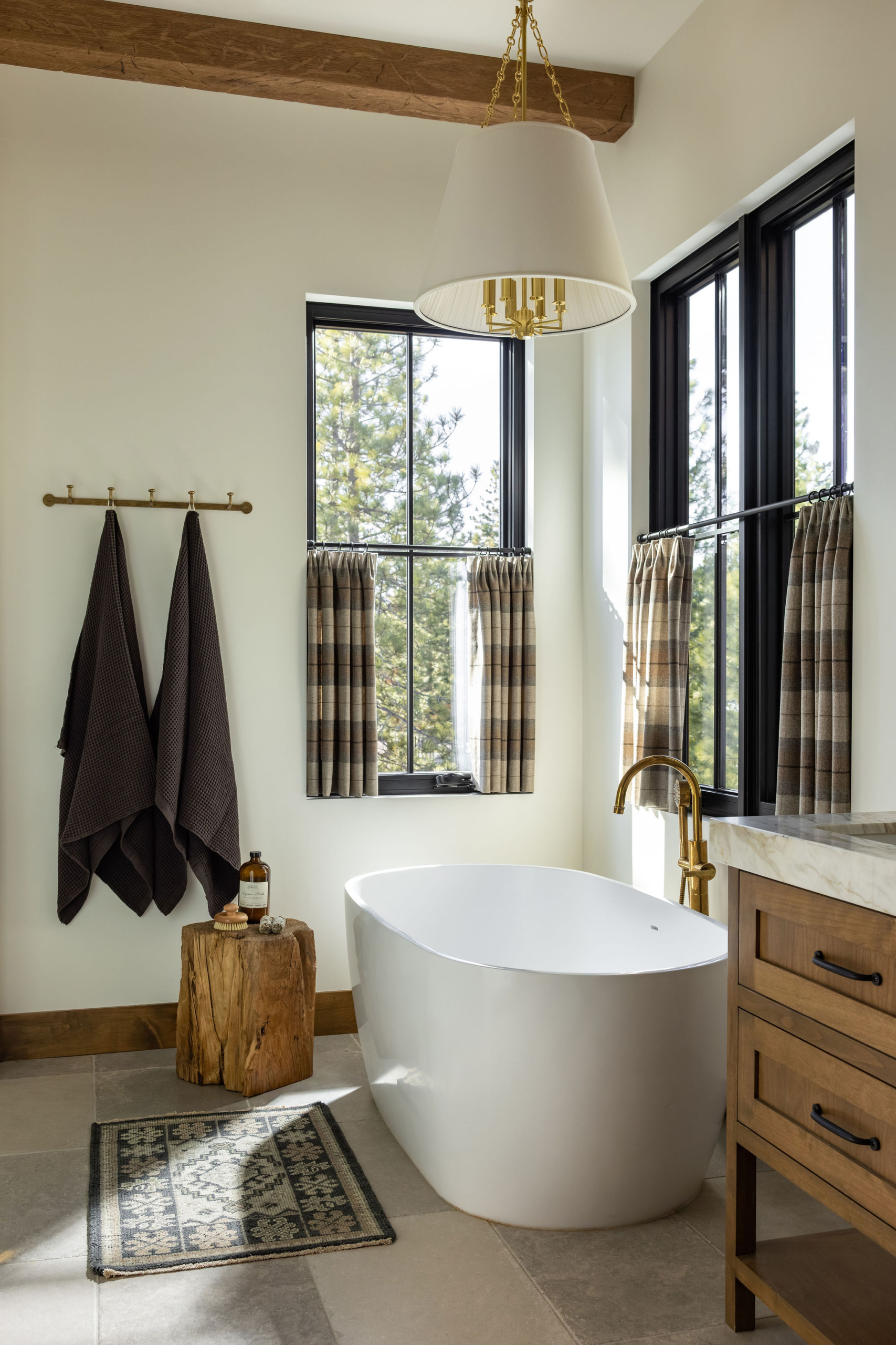 Custom elements — from a hand-chiseled fireplace crafted from local Tahoe granite to marble paired with wool curtains in the primary bath — anchor the design with a strong sense of place, blending timeless refinement with rustic warmth.